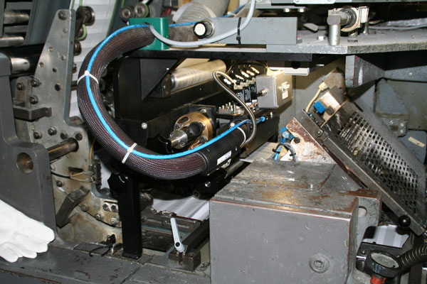Our solution includes a swivel and pull out bracket with side adjustment for the glue position, an applicator designed for this type of machine with suckback valve technology and an optimized slot nozzle geometrie. Further on there is a pattern controller and a machine interface realised with a Siemens control unit.Technical data
